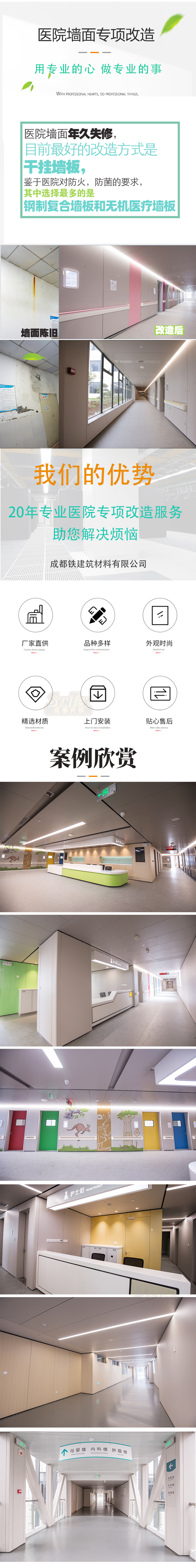 介紹:醫院墻板年久失修,目前最好的改造方式是干掛墻板,鑒于醫院對防火,防菌的要求,其中選擇最多的是鋼制復合墻板和無機醫療墻板。