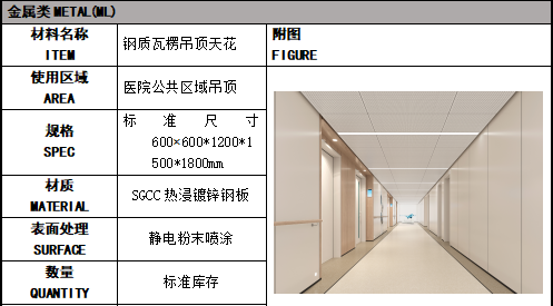 介紹:鋼制復合天花由鋼板+瓦楞組合而成,暗架結構,具有安裝便捷,板面大,平整度高,完美搭配燈帶、通風設備帶,有多種組合選擇,適用于醫院公共區域吊頂